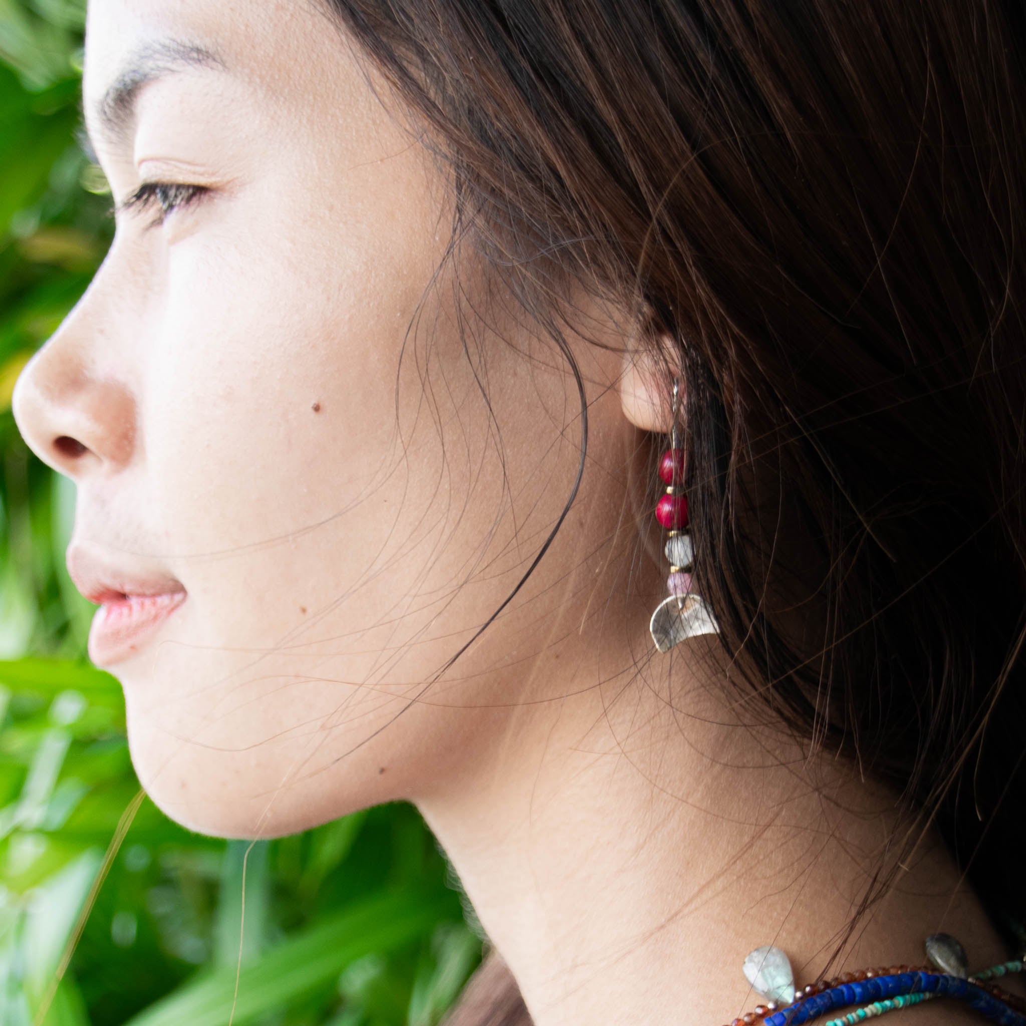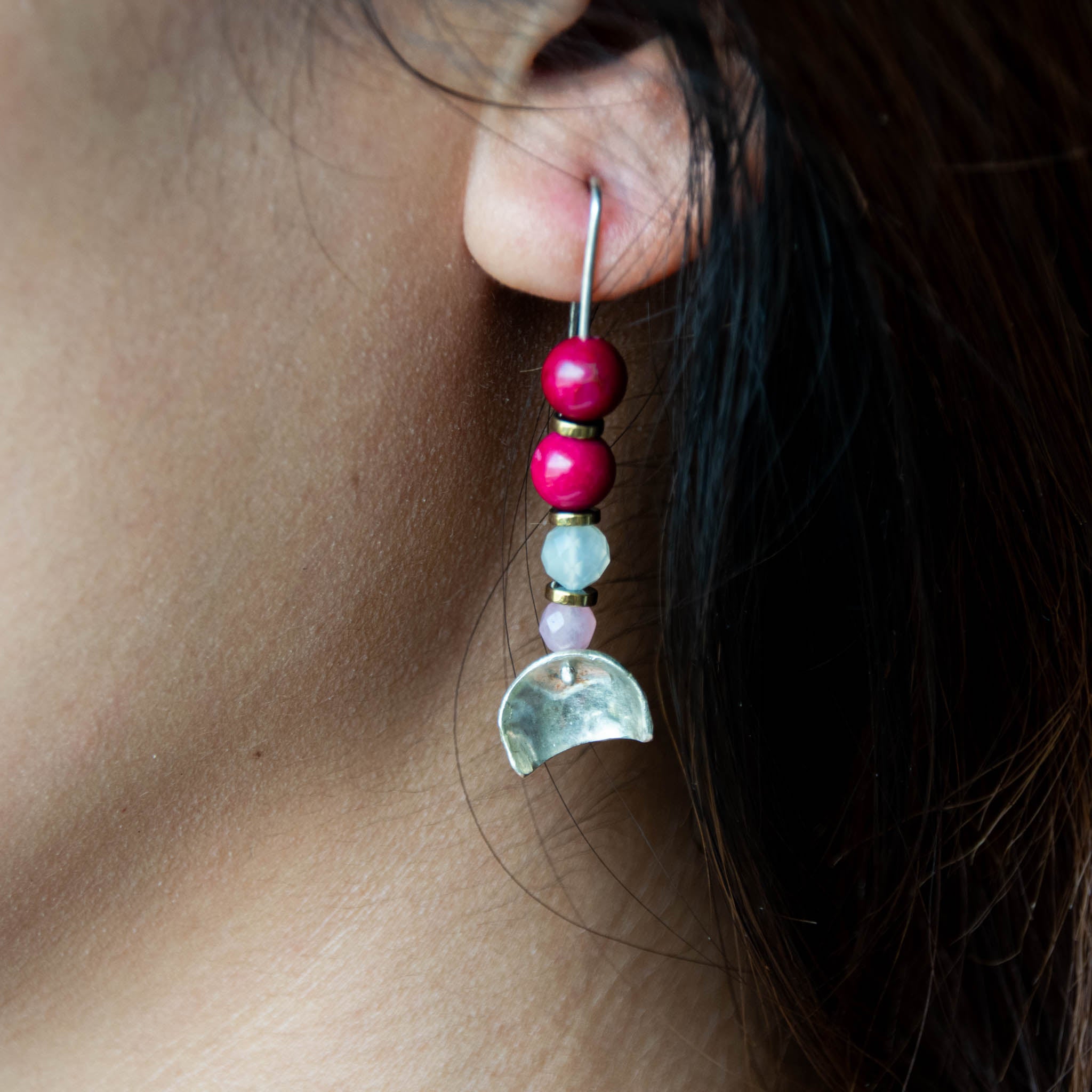 The silver wire enters the ear and continues to decorate the ear as part of the earring design, creating a symmetrical, eye-catching look.