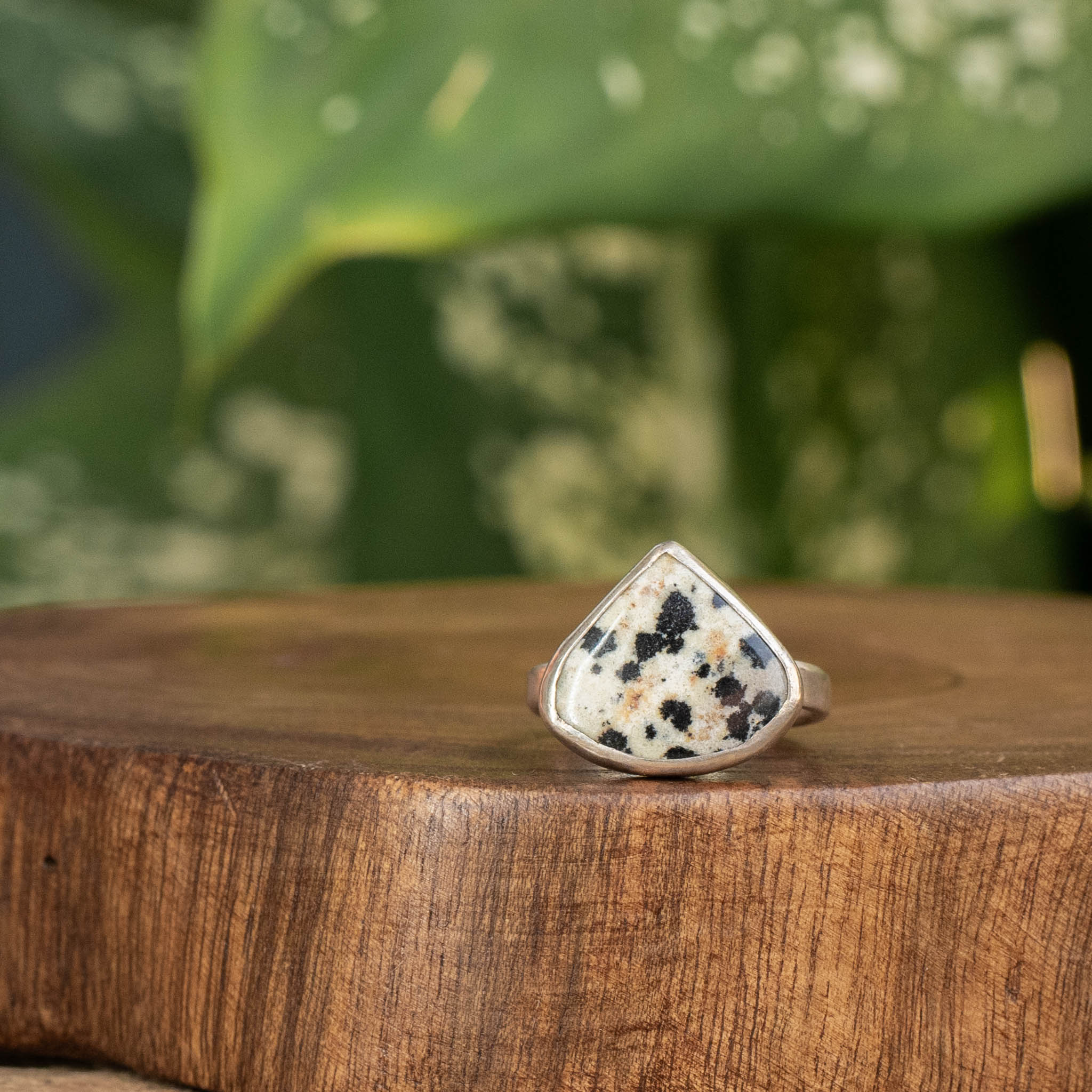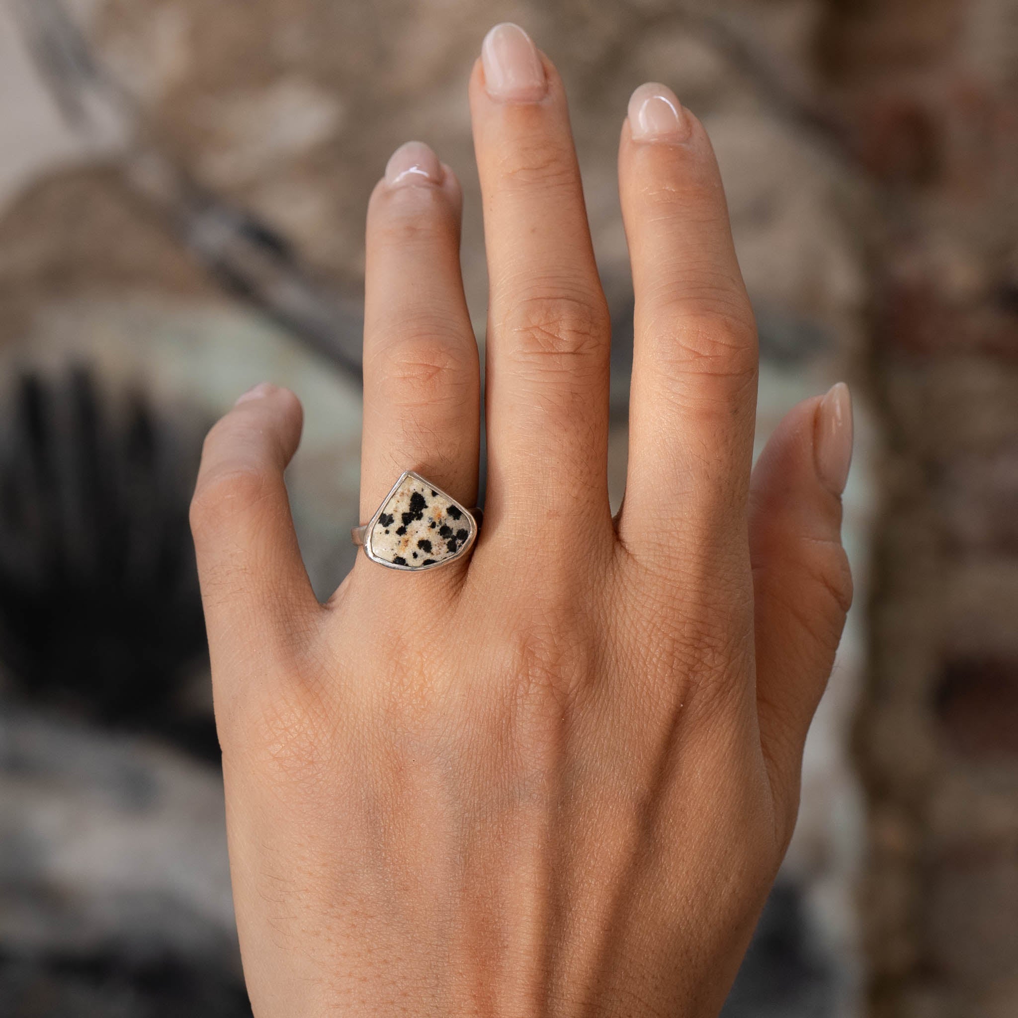Immerse yourself in the distinctive charm of our silver ring adorned with Dalmatian Jasper, known as the "stone of joy." This unique gem, characterized by its creamy beige base and scattered black spots resembling the coat of a Dalmatian, exudes an aura of positivity and happiness. Each ring showcases the natural beauty of this remarkable stone, carefully set to highlight its individual character. Handcrafted with precision and care, this ring is a celebration of both style and substance.