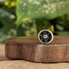 Presenting our exceptional one-of-a-kind ring showcasing a meticulously carved black onyx gemstone, complemented by dazzling stone-on-stone white topaz accents, all encased within a bezel of 14-karat gold, while the black oxidized sterling silver shank adds a touch of dramatic contrast, culminating in a breathtaking synthesis of elegance and allure.