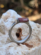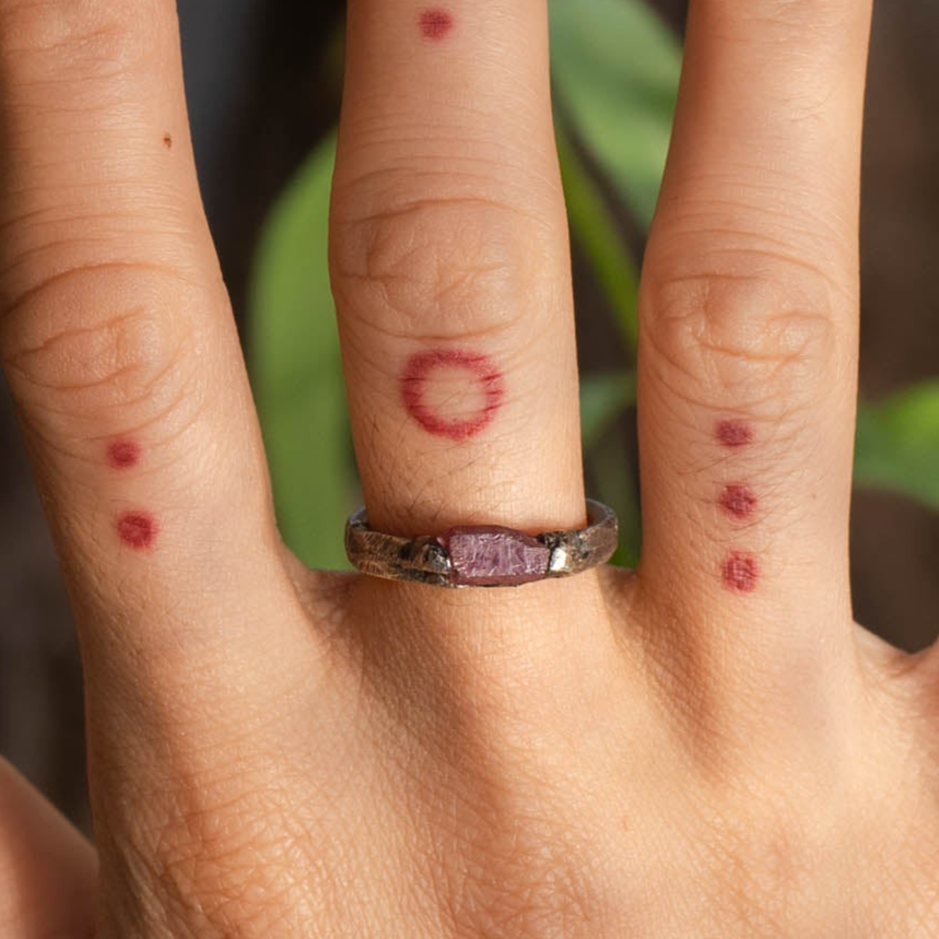 In this ring: Raw ruby is a natural, uncut gemstone known for its deep red color and powerful energy. It symbolizes passion, vitality, and courage, often associated with love and strength.