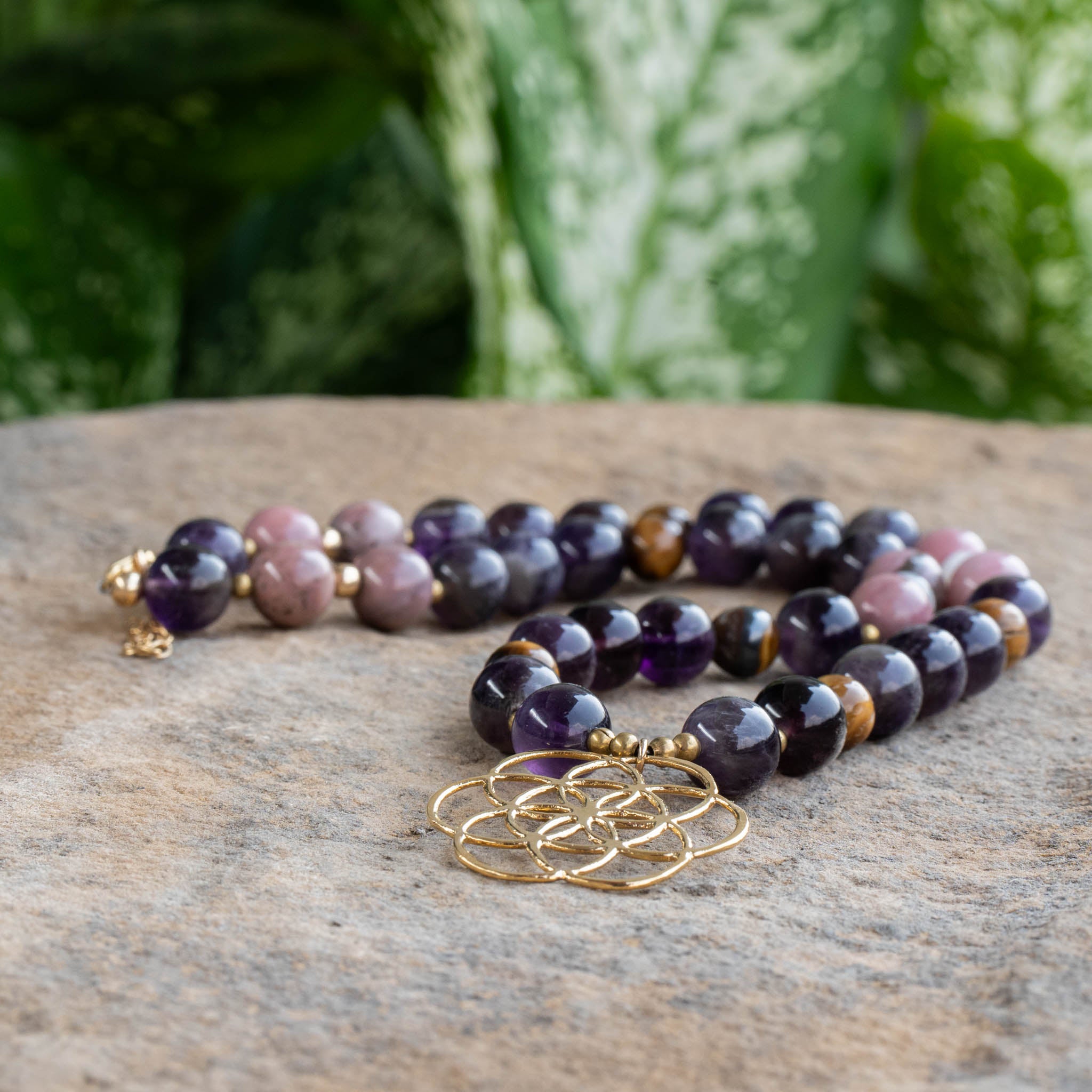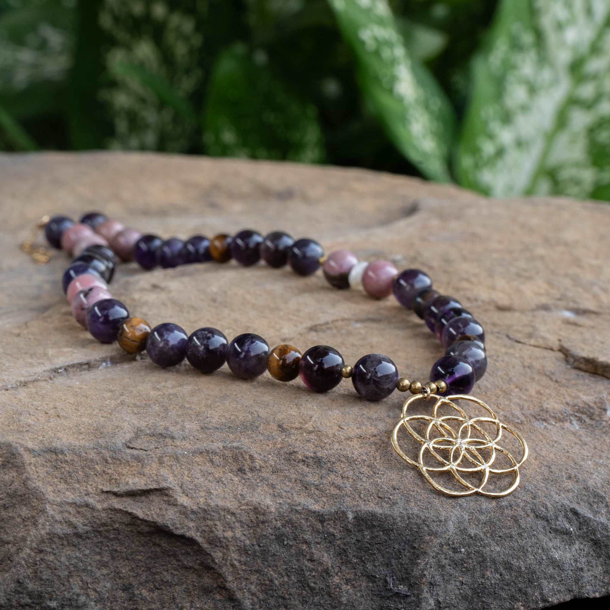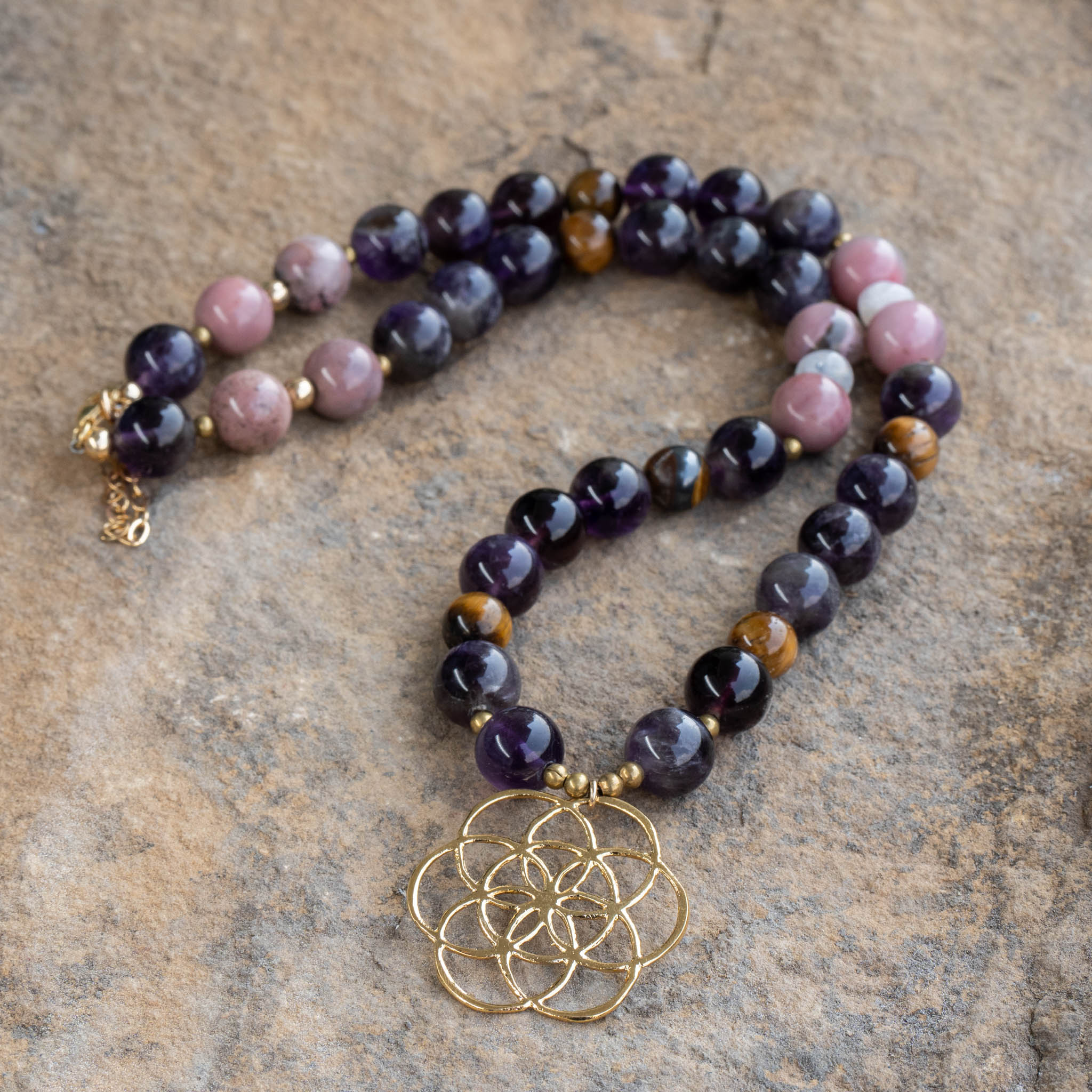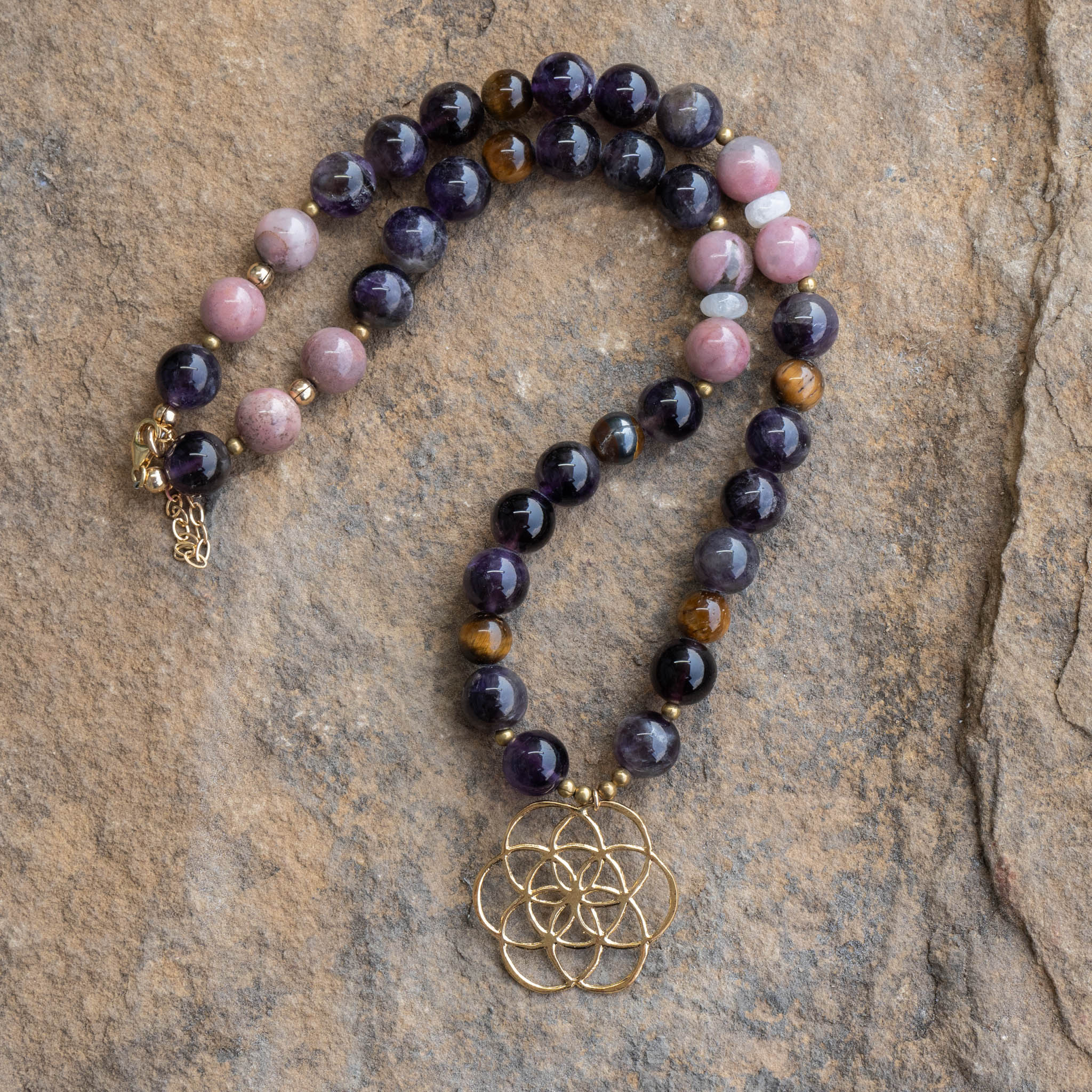 Amethyst, Tiger Eye, Moonstone, Rhodonite Necklace