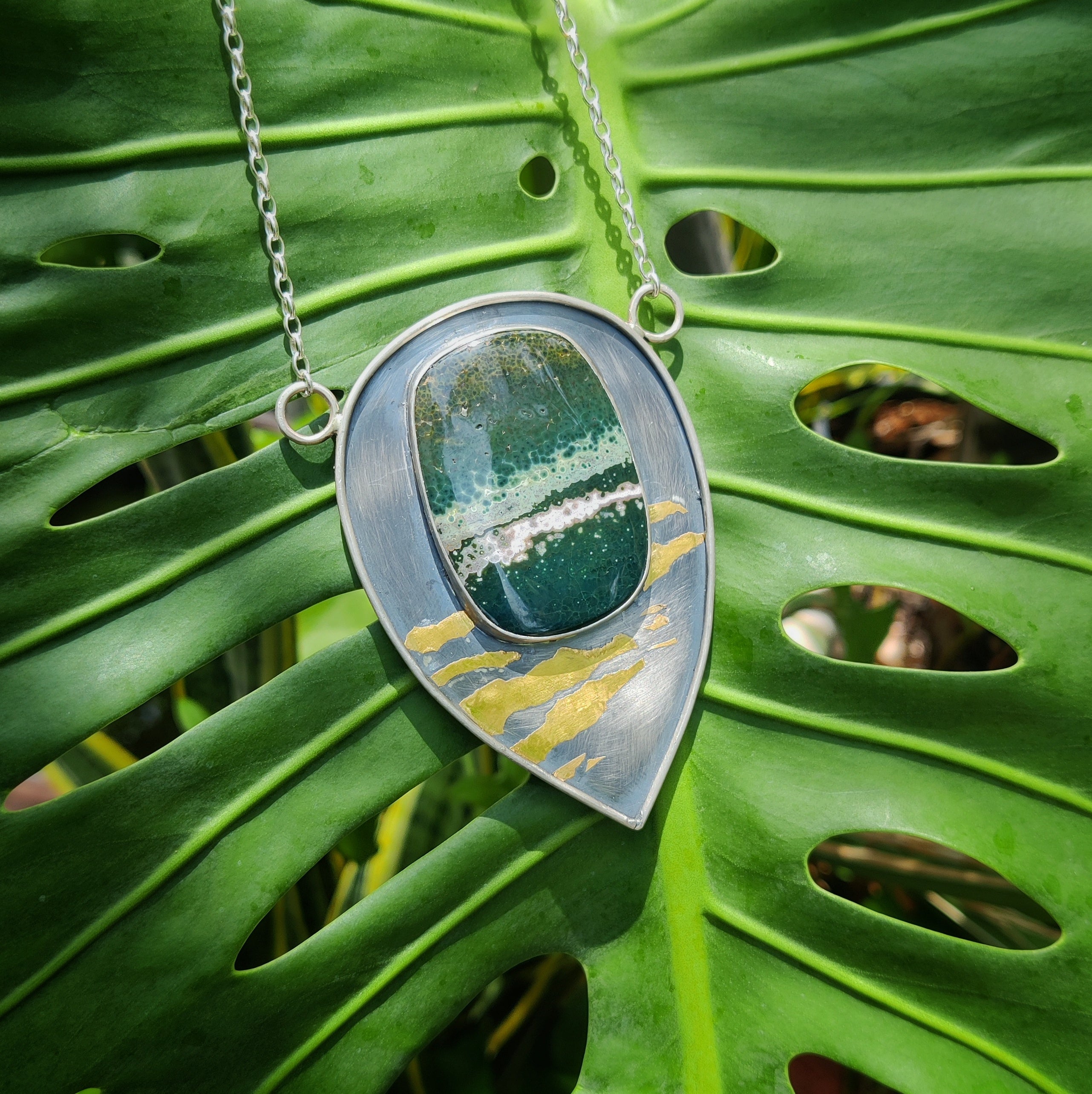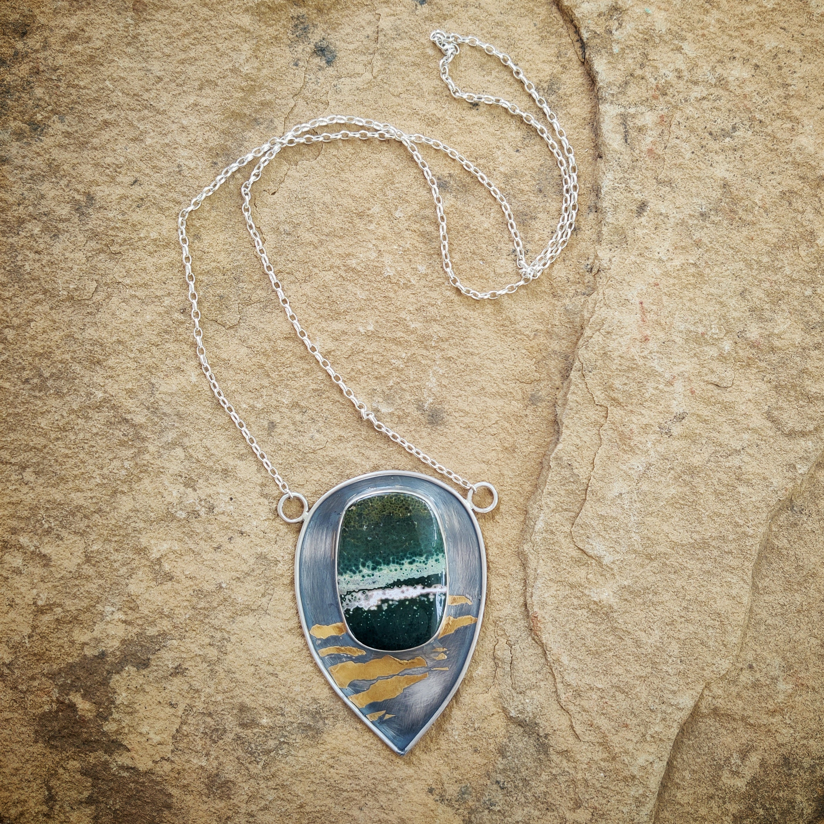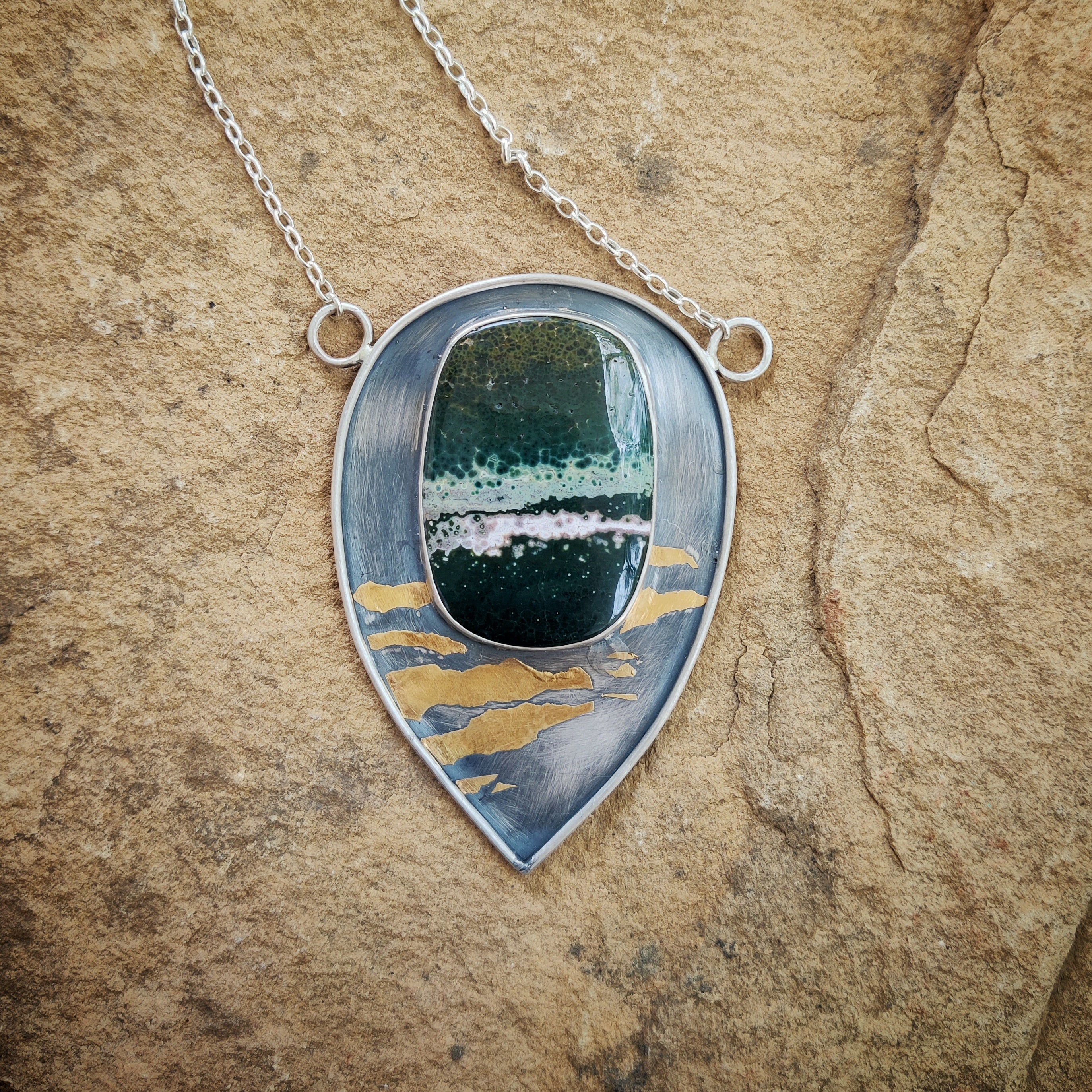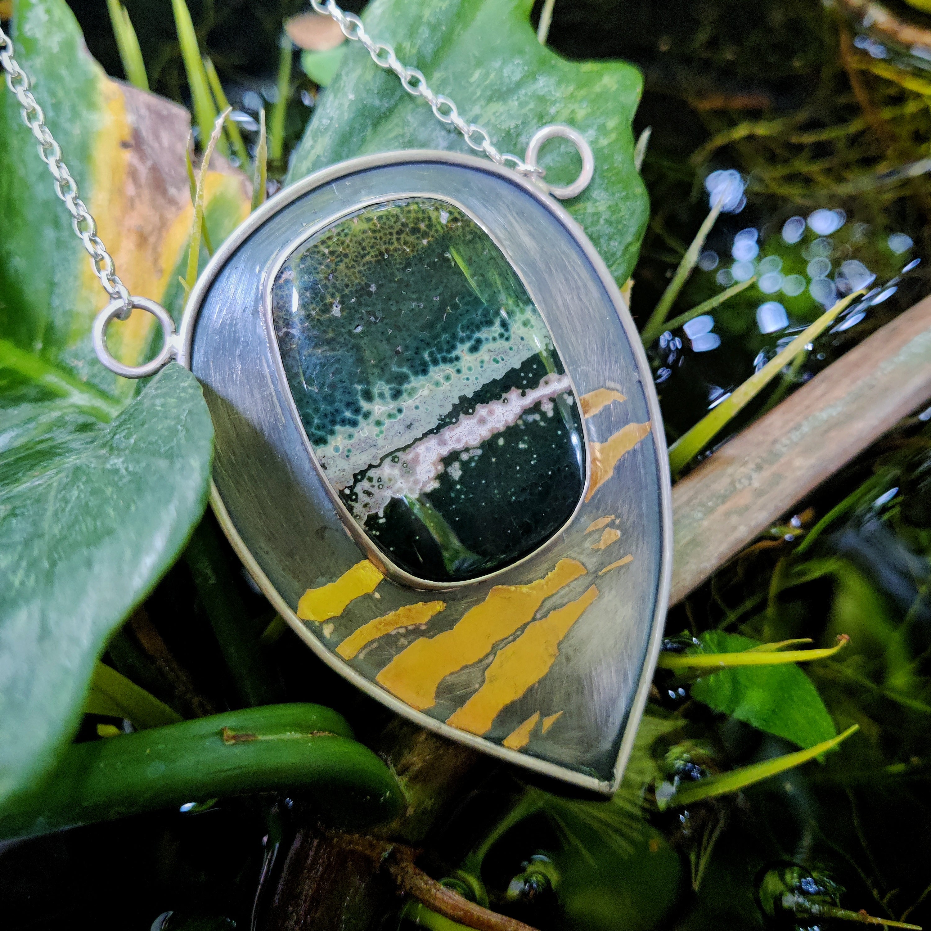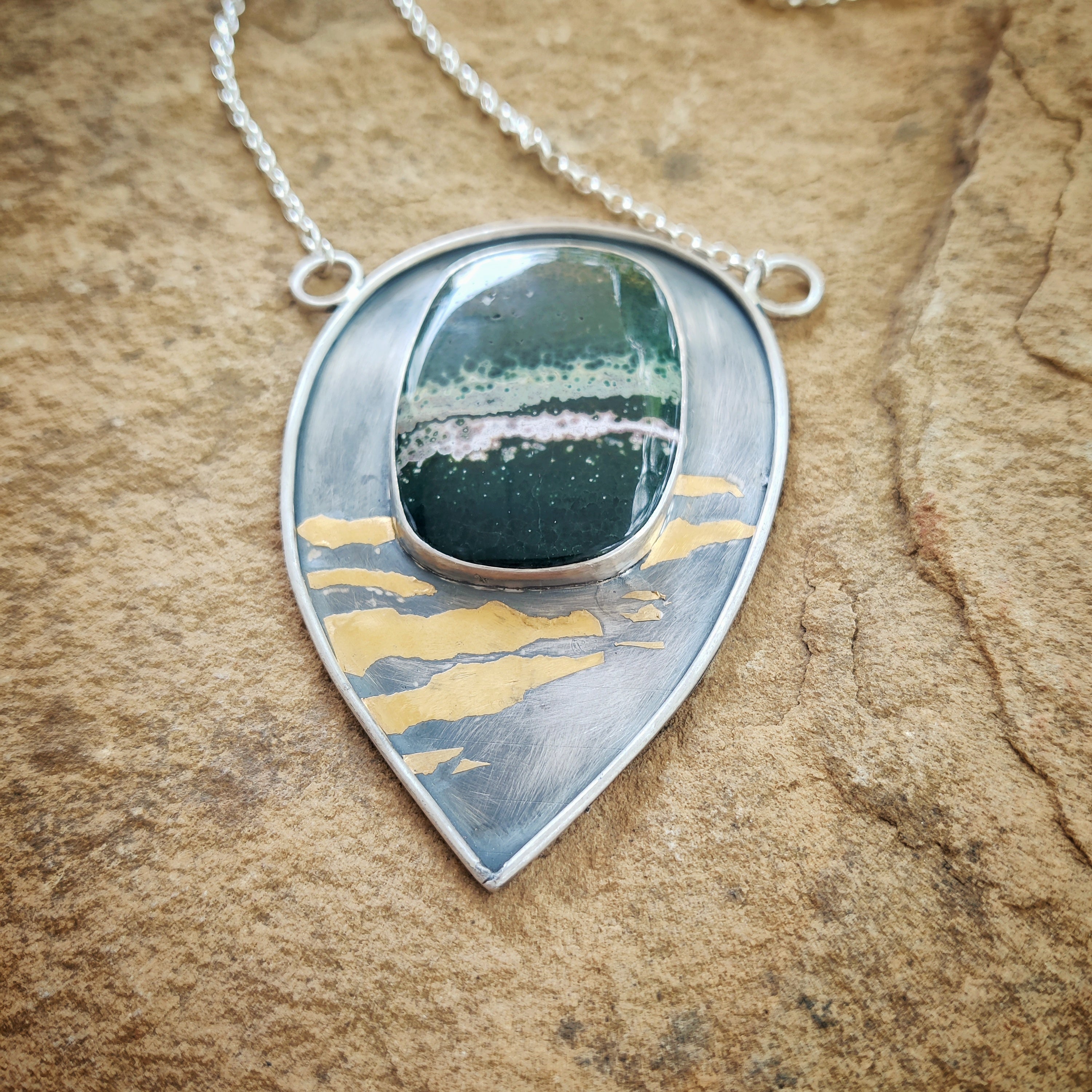 "GOLD ZEBRA" Necklace, Jasper Ocean, Pure Gold & Sterling Silver in Keum Boo
