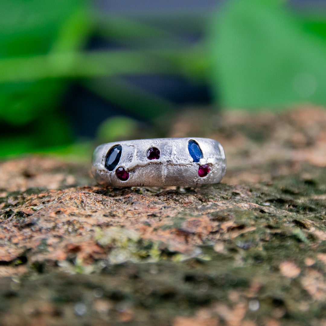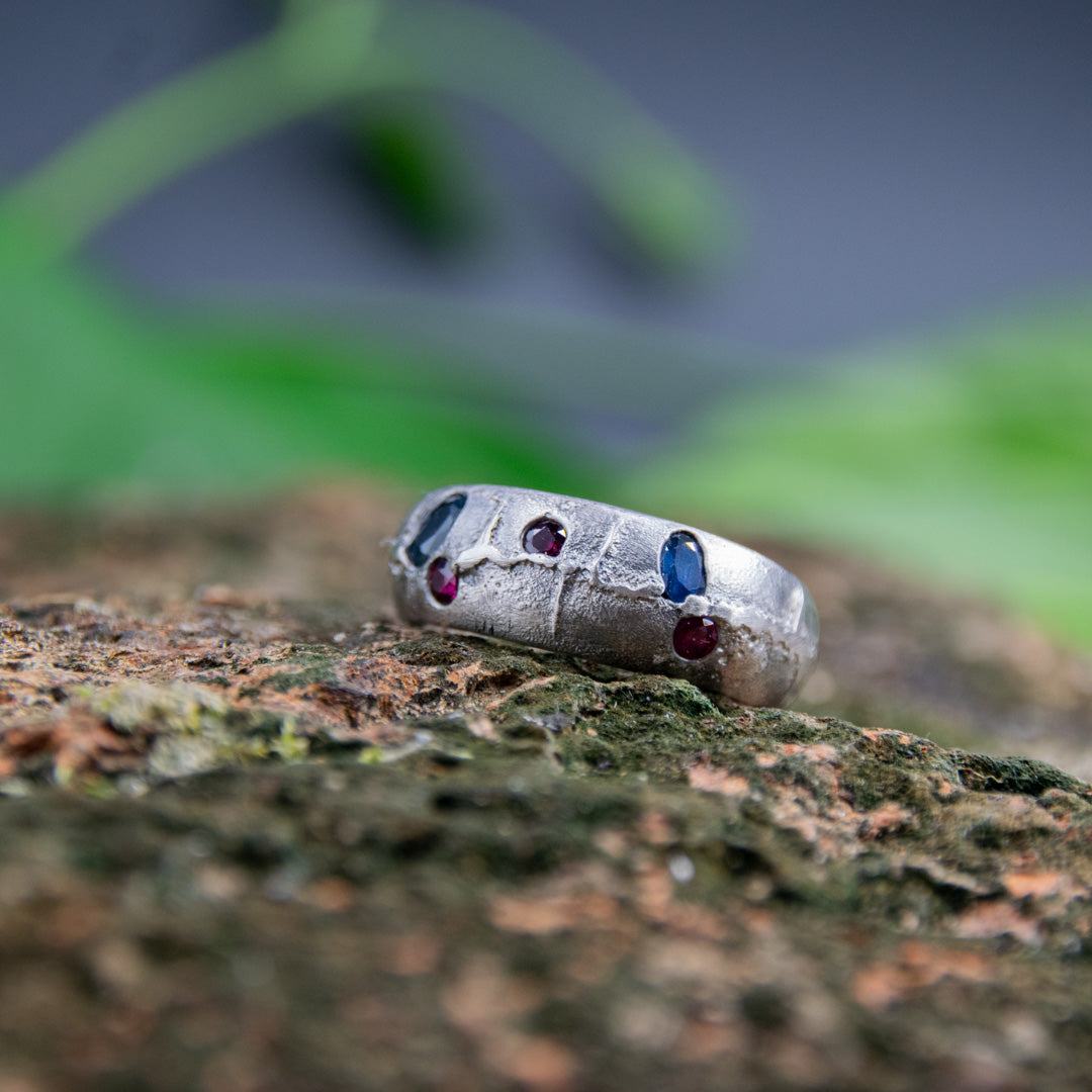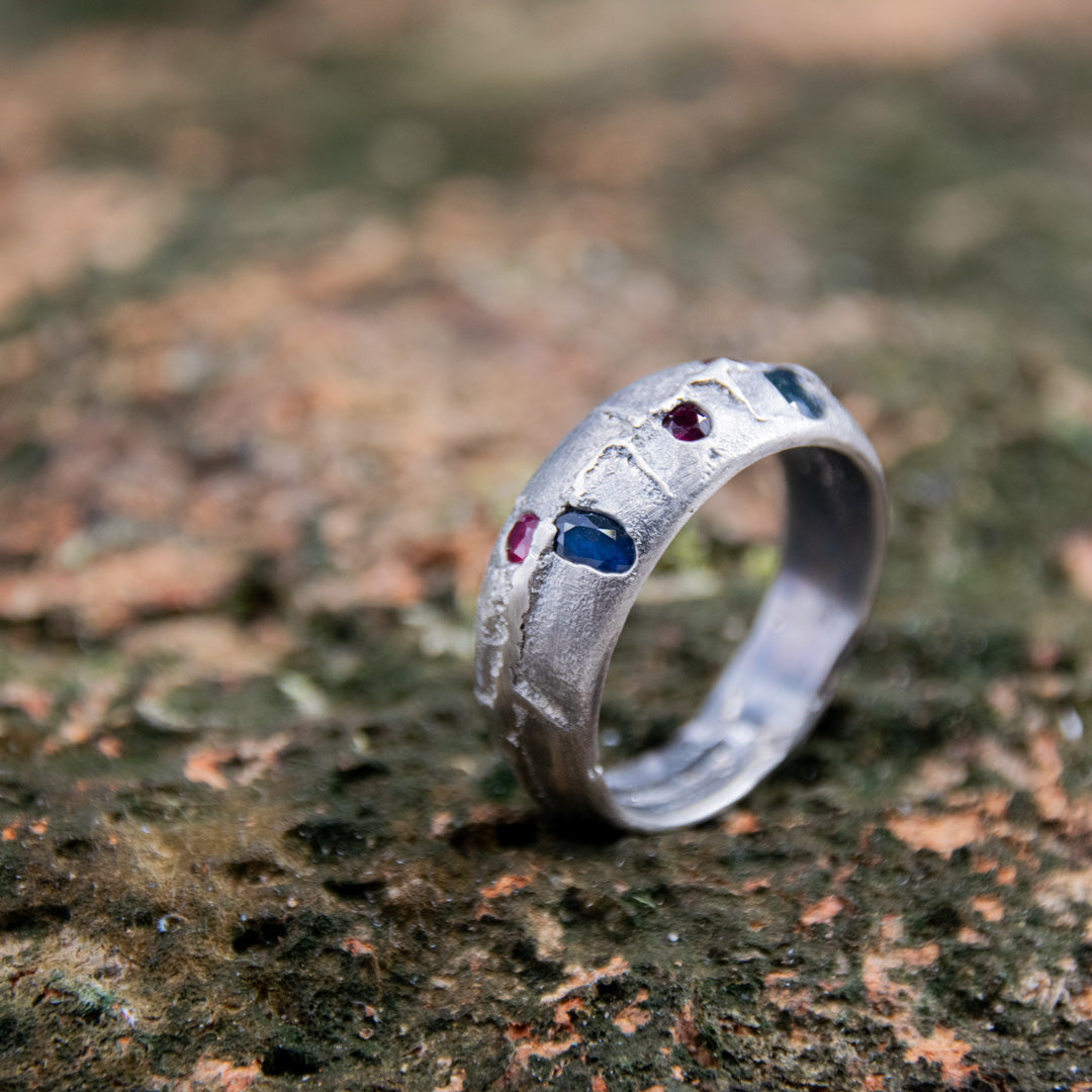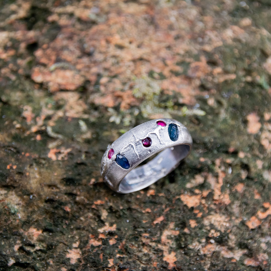 "STARS IN SILVER" Sandcasted Ring with Rubies And Sapphires