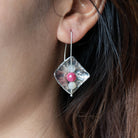 The silver wire enters the ear and continues to decorate the ear as part of the earring design, creating a symmetrical, eye-catching look.